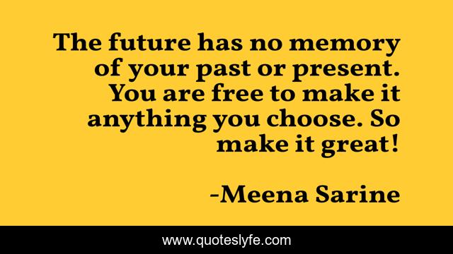 This page presents the quote "The future has no memory of your past or present. You are free to make it anything you choose. So make it great!". Author of this quote is Meena Sarine. This quote is about past, letting-go, positivity, behaviour, attitude, future, growth, hope, inspiration,.
