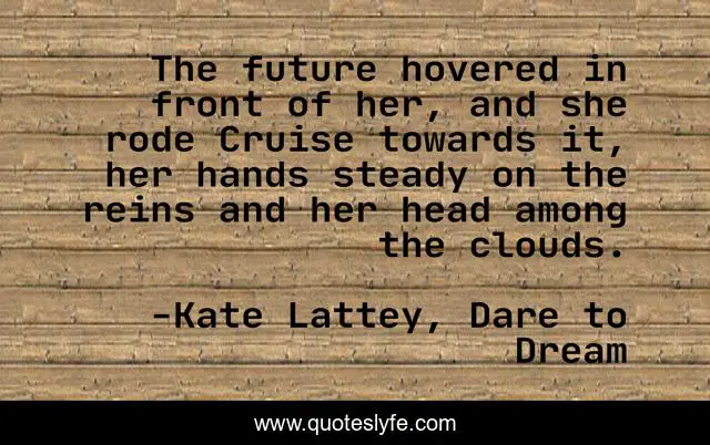 This page presents the quote "The future hovered in front of her, and she rode Cruise towards it, her hands steady on the reins and her head among the clouds.". Author of this quote is Kate Lattey, Dare to Dream. This quote is about future-plans, dream, head-in-the-clouds,.