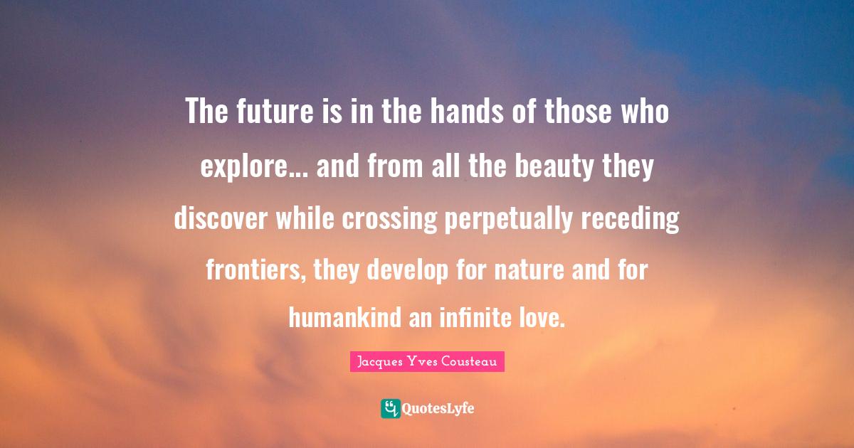 This page presents the quote "The future is in the hands of those who explore... and from all the beauty they discover while crossing perpetually receding frontiers, they develop for nature and for humankind an infinite love.". Author of this quote is Jacques Yves Cousteau. This quote is about future, ocean, frontiers, hands, humankind, sea, nature, infinite love, beauty,.