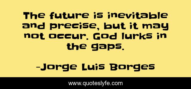 This page presents the quote "The future is inevitable and precise, but it may not occur. God lurks in the gaps.". Author of this quote is Jorge Luis Borges. This quote is about precise, god, lurks, future, gaps, inevitable,.
