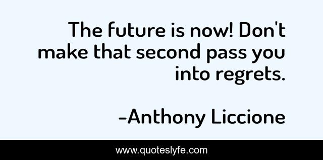 This page presents the quote "The future is now! Don't make that second pass you into regrets.". Author of this quote is Anthony Liccione. This quote is about chances, past, second, mistakes, should-of-would-of-could-of, time, future, regrets,.