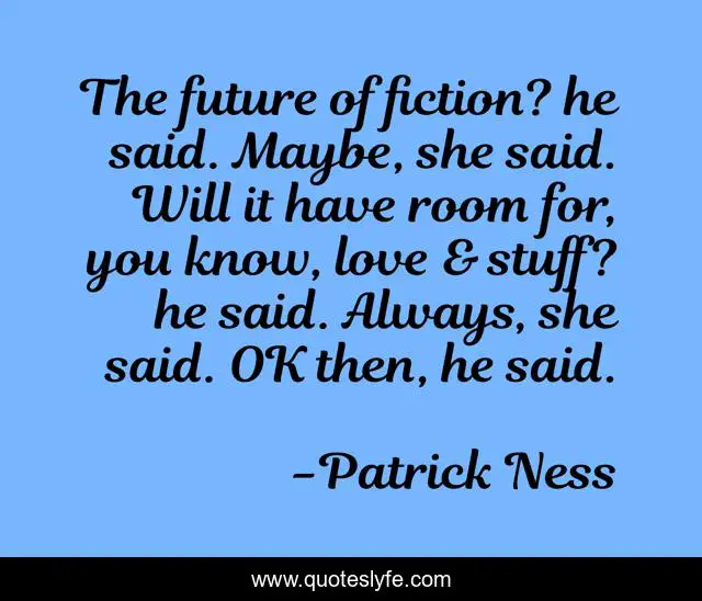 This page presents the quote "The future of fiction? he said. Maybe, she said. Will it have room for, you know, love & stuff? he said. Always, she said. OK then, he said.". Author of this quote is Patrick Ness. This quote is about twitter-fiction, challenge, patrick-ness, the-guardian,.