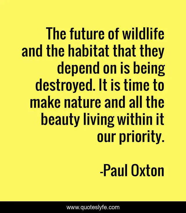 This page presents the quote "The future of wildlife and the habitat that they depend on is being destroyed. It is time to make nature and all the beauty living within it our priority.". Author of this quote is Paul Oxton. This quote is about animal-welfare, wildlife, africa, animal-rights, wildlife-conservation,.