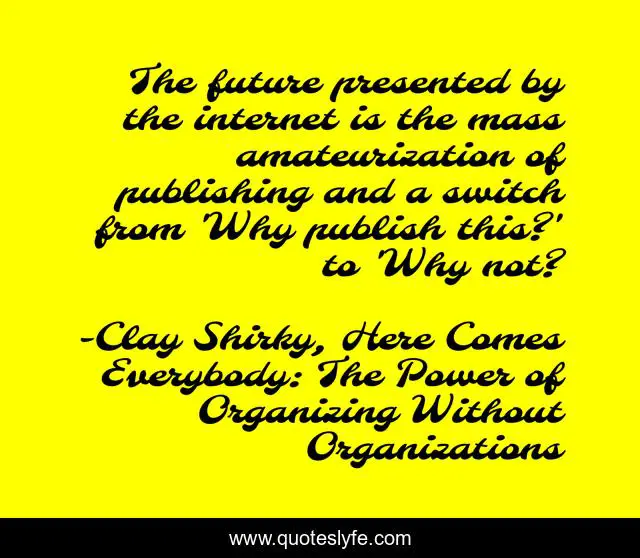 This page presents the quote "The future presented by the internet is the mass amateurization of publishing and a switch from 'Why publish this?' to 'Why not?". Author of this quote is Clay Shirky, Here Comes Everybody: The Power of Organizing Without Organizations. .