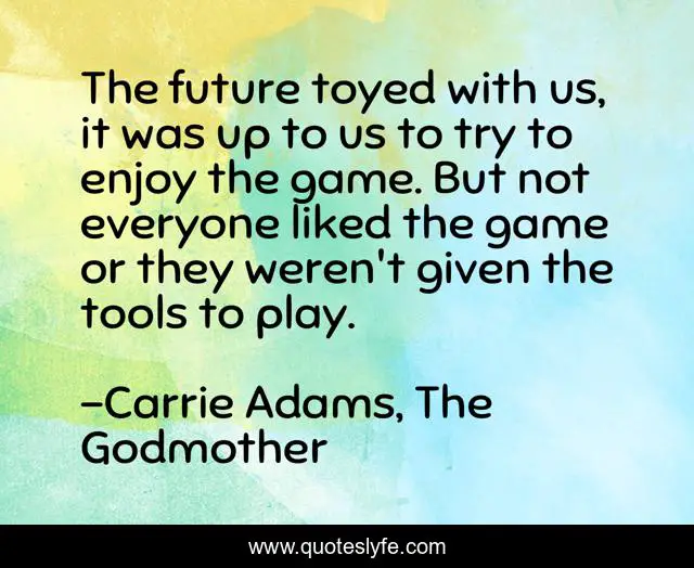 This page presents the quote "The future toyed with us, it was up to us to try to enjoy the game. But not everyone liked the game or they weren't given the tools to play.". Author of this quote is Carrie Adams, The Godmother. This quote is about future, time,.