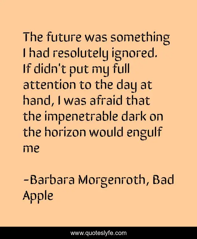 This page presents the quote "The future was something I had resolutely ignored. If didn't put my full attention to the day at hand, I was afraid that the impenetrable dark on the horizon would engulf me". Author of this quote is Barbara Morgenroth, Bad Apple. This quote is about drama, life, future, present,.