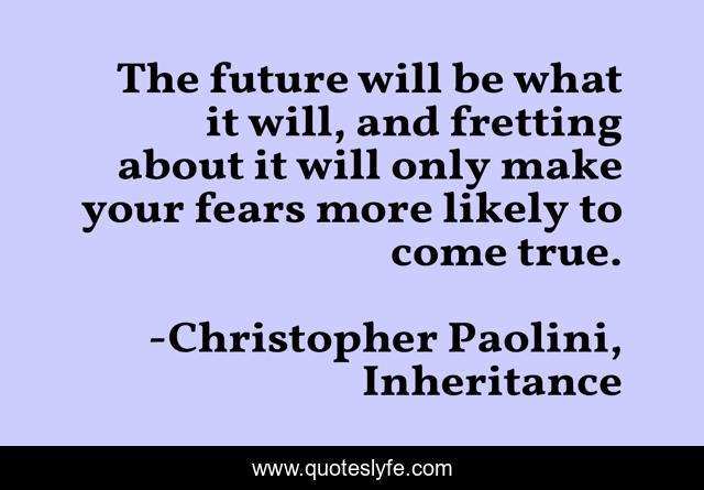 This page presents the quote "The future will be what it will, and fretting about it will only make your fears more likely to come true.". Author of this quote is Christopher Paolini, Inheritance. This quote is about worries, fear, future, worrying, wisdom,.