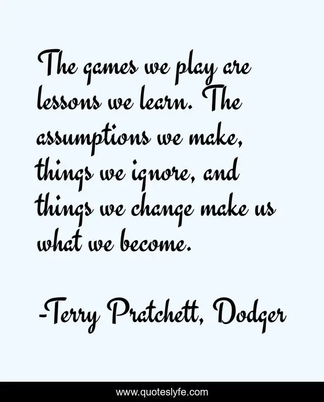 This page presents the quote "The games we play are lessons we learn. The assumptions we make, things we ignore, and things we change make us what we become.". Author of this quote is Terry Pratchett, Dodger. .