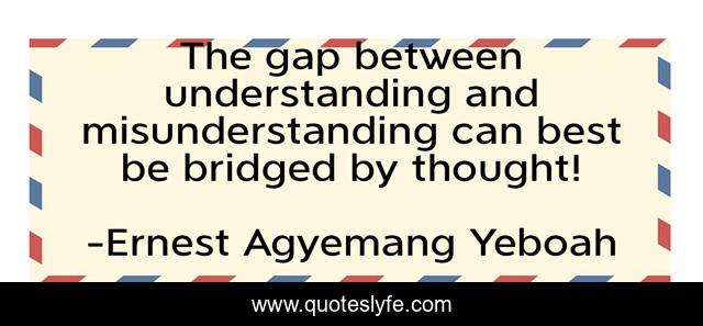 This page presents the quote "The gap between understanding and misunderstanding can best be bridged by thought!". Author of this quote is Ernest Agyemang Yeboah. This quote is about life, litigations-mediationm, understanding-others, solving-problems, mediation, misunderstanding, thought, quotes-on-thought, understanding-the-problem,.