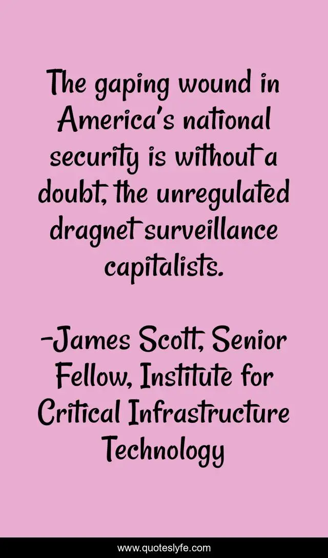 This page presents the quote "The gaping wound in America’s national security is without a doubt, the unregulated dragnet surveillance capitalists.". Author of this quote is James Scott, Senior Fellow, Institute for Critical Infrastructure Technology. This quote is about cybersecurity, capitalists, surveillance, dragnet, national-security, james-scott, america,.