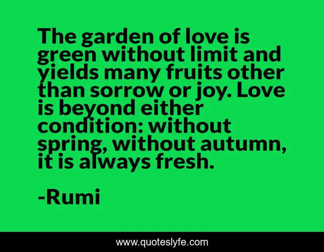 This page presents the quote "The garden of love is green without limit and yields many fruits other than sorrow or joy. Love is beyond either condition: without spring, without autumn, it is always fresh.". Author of this quote is Rumi. This quote is about autumn, joy, love is,.