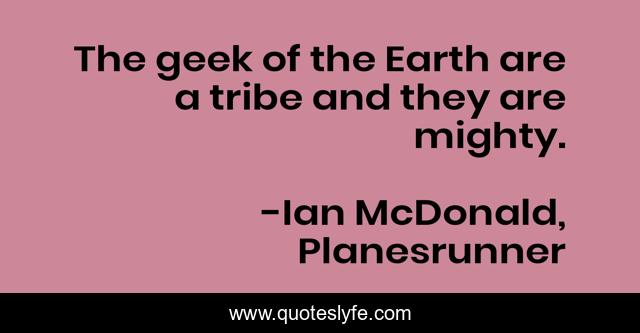 This page presents the quote "The geek of the Earth are a tribe and they are mighty.". Author of this quote is Ian McDonald, Planesrunner. This quote is about geek, unity, nerd-culture, geek-culture, solidarity,.