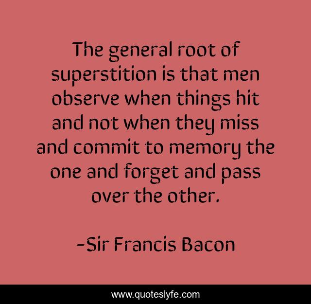 This page presents the quote "The general root of superstition is that men observe when things hit and not when they miss and commit to memory the one and forget and pass over the other.". Author of this quote is Sir Francis Bacon. .