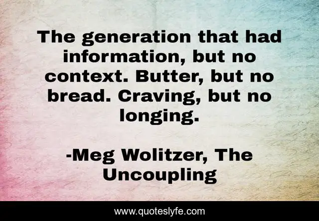 This page presents the quote "The generation that had information, but no context. Butter, but no bread. Craving, but no longing.". Author of this quote is Meg Wolitzer, The Uncoupling. This quote is about attention-span, social-media, young-adults, next-generation,.