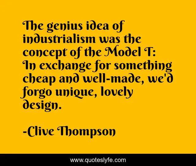 This page presents the quote "The genius idea of industrialism was the concept of the Model T: In exchange for something cheap and well-made, we'd forgo unique, lovely design.". Author of this quote is Clive Thompson. This quote is about genius, unique, lovely,.