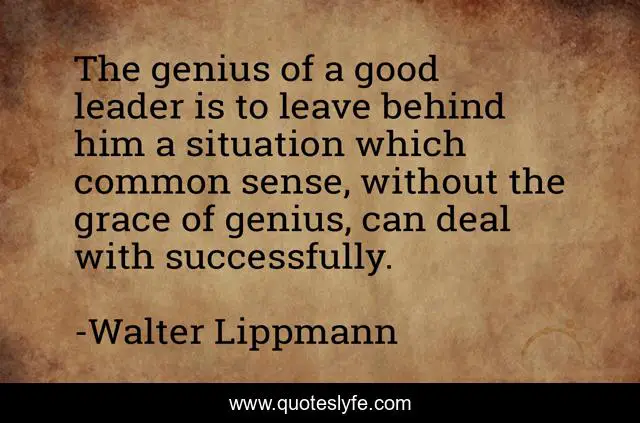 This page presents the quote "The genius of a good leader is to leave behind him a situation which common sense, without the grace of genius, can deal with successfully.". Author of this quote is Walter Lippmann. This quote is about good, leader, grace,.