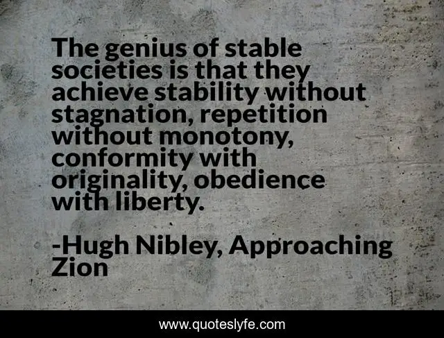 This page presents the quote "The genius of stable societies is that they achieve stability without stagnation, repetition without monotony, conformity with originality, obedience with liberty.". Author of this quote is Hugh Nibley, Approaching Zion. This quote is about society, utopia, zion,.