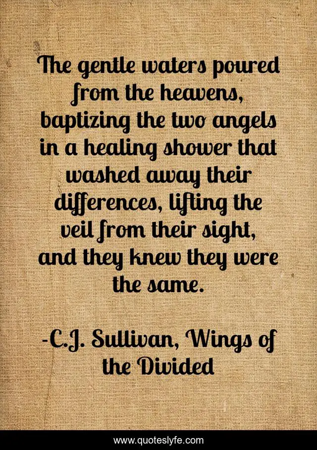 This page presents the quote "The gentle waters poured from the heavens, baptizing the two angels in a healing shower that washed away their differences, lifting the veil from their sight, and they knew they were the same.". Author of this quote is C.J. Sullivan, Wings of the Divided. This quote is about redemption, forgiveness, unity, oneness, supernatural, angels, war,.