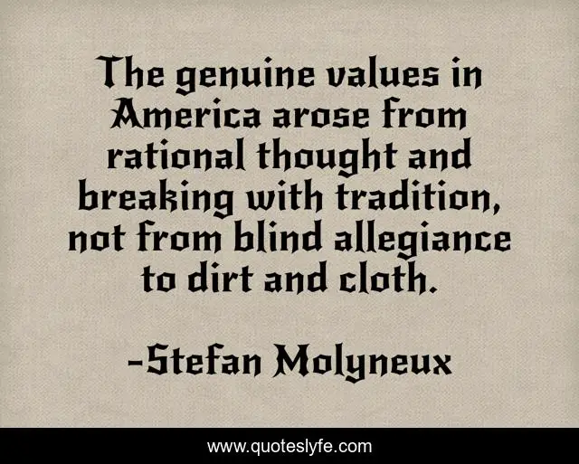 This page presents the quote "The genuine values in America arose from rational thought and breaking with tradition, not from blind allegiance to dirt and cloth.". Author of this quote is Stefan Molyneux. This quote is about libertarian, stefan-molyneux, freedomain-radio,.