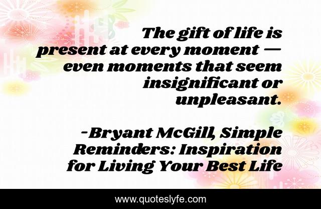 This page presents the quote "The gift of life is present at every moment — even moments that seem insignificant or unpleasant.". Author of this quote is Bryant McGill, Simple Reminders: Inspiration for Living Your Best Life. This quote is about gifts, moments, unpleasant, insignificant,.