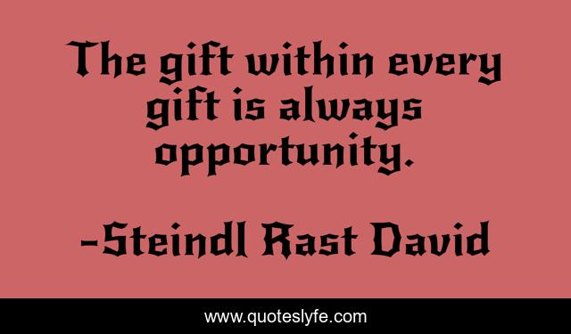 This page presents the quote "The gift within every gift is always opportunity.". Author of this quote is Steindl Rast David. This quote is about enthusiasm, philosophical, inspirational,.