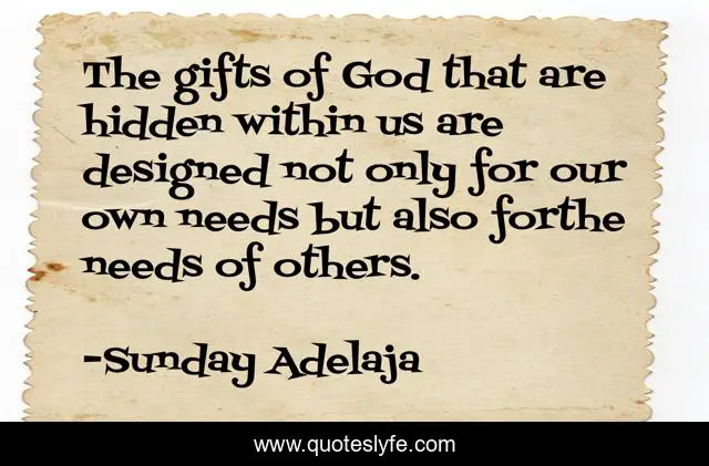 This page presents the quote "The gifts of God that are hidden within us are designed not only for our own needs but also forthe needs of others.". Author of this quote is Sunday Adelaja. This quote is about gifts, hidden, designed,.