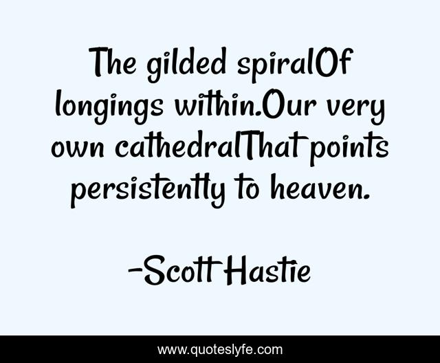 This page presents the quote "The gilded spiralOf longings within.Our very own cathedralThat points persistently to heaven.". Author of this quote is Scott Hastie. This quote is about longing, spiritual, own, gilded, point, longings, persistent, poetry, spirituality,.