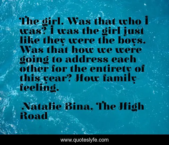 This page presents the quote "The girl. Was that who I was? I was the girl just like they were the boys. Was that how we were going to address each other for the entirety of this year? How family-feeling.". Author of this quote is Natalie Bina, The High Road. This quote is about boys, girls, friendship, girls-and-boys,.