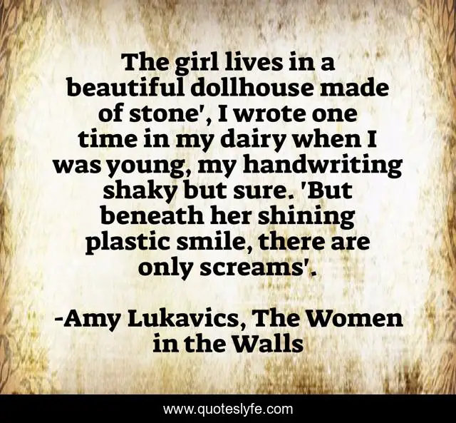 This page presents the quote "The girl lives in a beautiful dollhouse made of stone', I wrote one time in my dairy when I was young, my handwriting shaky but sure. 'But beneath her shining plastic smile, there are only screams'.". Author of this quote is Amy Lukavics, The Women in the Walls. This quote is about horror, dollhouse, women-in-the-walls,.
