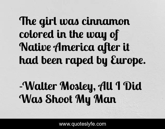 This page presents the quote "The girl was cinnamon colored in the way of Native America after it had been raped by Europe.". Author of this quote is Walter Mosley, All I Did Was Shoot My Man. This quote is about mystery, leonid-mcgill,.