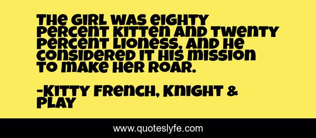 This page presents the quote "The girl was eighty percent kitten and twenty percent lioness, and he considered it his mission to make her roar.". Author of this quote is Kitty French, Knight & Play. This quote is about romance, erotica,.