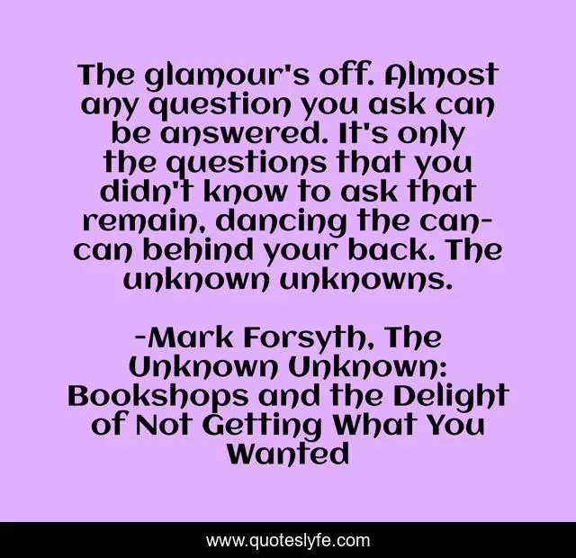 This page presents the quote "The glamour's off. Almost any question you ask can be answered. It's only the questions that you didn't know to ask that remain, dancing the can-can behind your back. The unknown unknowns.". Author of this quote is Mark Forsyth, The Unknown Unknown: Bookshops and the Delight of Not Getting What You Wanted. This quote is about books, humour, questions,.