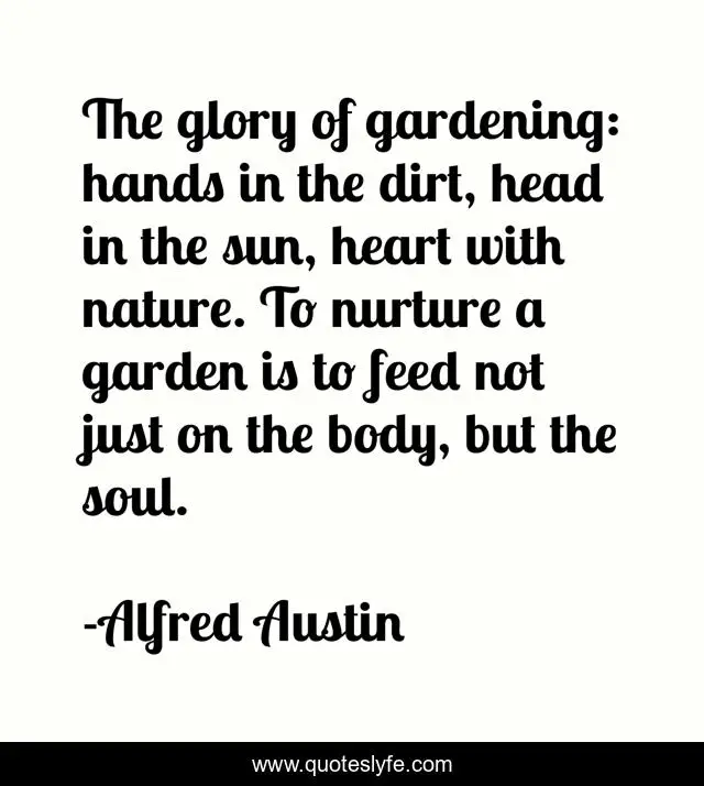 This page presents the quote "The glory of gardening: hands in the dirt, head in the sun, heart with nature. To nurture a garden is to feed not just on the body, but the soul.". Author of this quote is Alfred Austin. This quote is about sun, gardening, soul,.