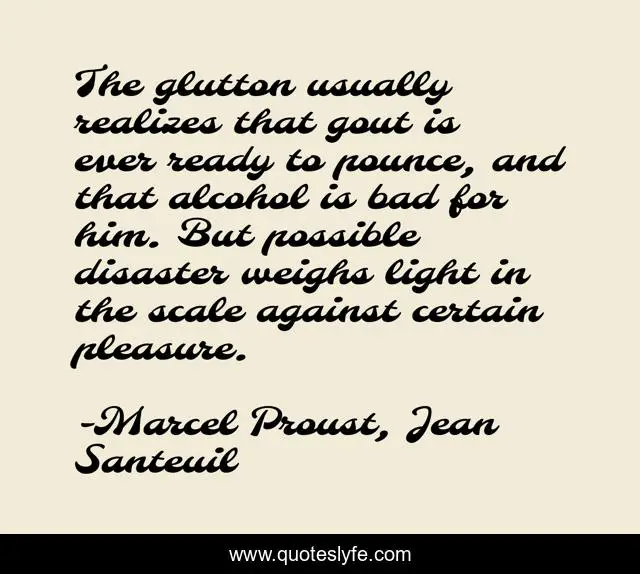 This page presents the quote "The glutton usually realizes that gout is ever ready to pounce, and that alcohol is bad for him. But possible disaster weighs light in the scale against certain pleasure.". Author of this quote is Marcel Proust, Jean Santeuil. This quote is about gout, glutton, pleasure,.