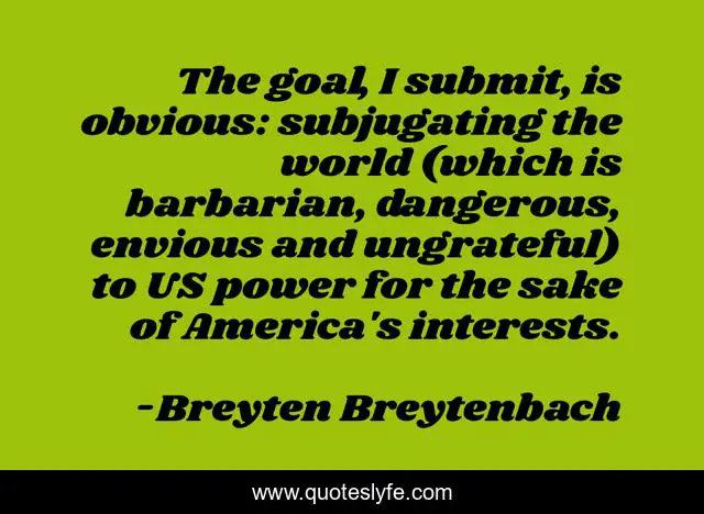 This page presents the quote "The goal, I submit, is obvious: subjugating the world (which is barbarian, dangerous, envious and ungrateful) to US power for the sake of America's interests.". Author of this quote is Breyten Breytenbach. This quote is about world, america, goal,.