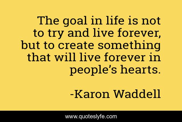 This page presents the quote "The goal in life is not to try and live forever, but to create something that will live forever in people’s hearts.". Author of this quote is Karon Waddell. This quote is about life-goals, live-an-extraordinary-life, hearts-of-people, quotes, inspirational, quotes-to-live-by, enthusiasm,.