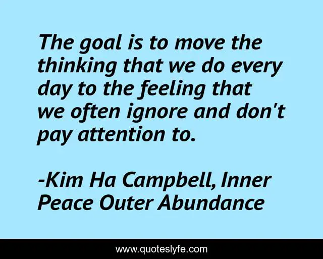 This page presents the quote "The goal is to move the thinking that we do every day to the feeling that we often ignore and don't pay attention to.". Author of this quote is Kim Ha Campbell, Inner Peace Outer Abundance. This quote is about inner-peace-outer-abundance, love, thinking, positive, motivational, confidence, feelings, kim-ha-campbell, goals,.