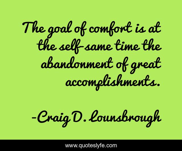 This page presents the quote "The goal of comfort is at the self-same time the abandonment of great accomplishments.". Author of this quote is Craig D. Lounsbrough. This quote is about ease, comfort, familiarity, comfortable, passive, accomplishments, goals, mediocrity, objectives,.