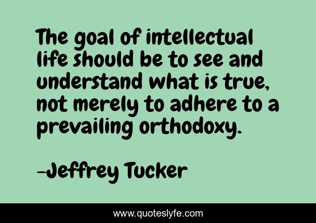 This page presents the quote "The goal of intellectual life should be to see and understand what is true, not merely to adhere to a prevailing orthodoxy.". Author of this quote is Jeffrey Tucker. This quote is about self-knowledge, intelligence, liberty, indoctrination, rationality, freedom, critical-thinking,.