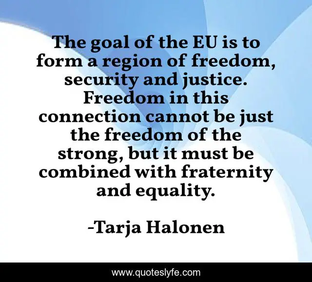 This page presents the quote "The goal of the EU is to form a region of freedom, security and justice. Freedom in this connection cannot be just the freedom of the strong, but it must be combined with fraternity and equality.". Author of this quote is Tarja Halonen. This quote is about justice, freedom, strong,.