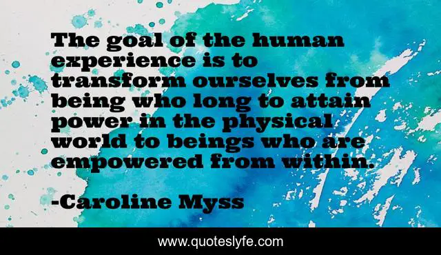 This page presents the quote "The goal of the human experience is to transform ourselves from being who long to attain power in the physical world to beings who are empowered from within.". Author of this quote is Caroline Myss. This quote is about transform, transformation, empowererment,.