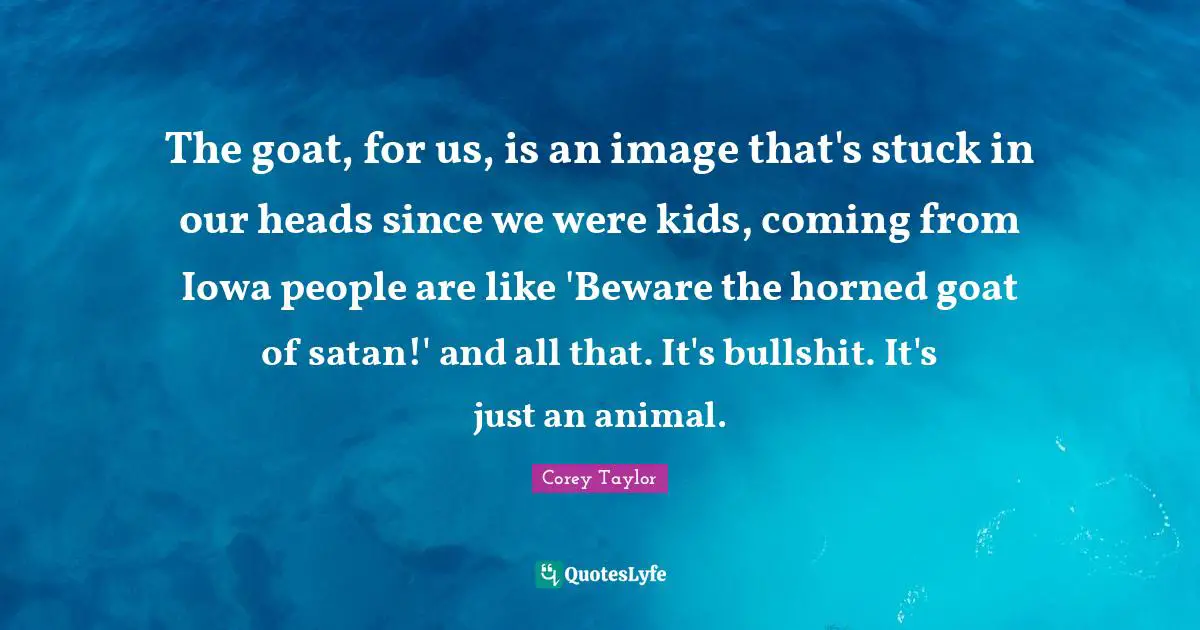 This page presents the quote "The goat, for us, is an image that's stuck in our heads since we were kids, coming from Iowa people are like 'Beware the horned goat of satan!' and all that. It's bullshit. It's just an animal.". Author of this quote is Corey Taylor. This quote is about iowa, bullshit, people, stuck, satan, kids, animal,.