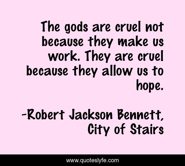 This page presents the quote "The gods are cruel not because they make us work. They are cruel because they allow us to hope.". Author of this quote is Robert Jackson Bennett, City of Stairs. This quote is about gods, religion,.