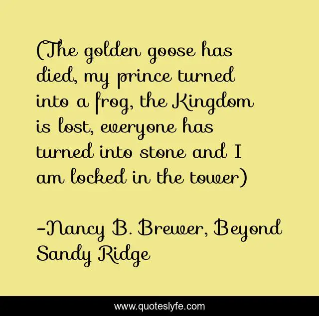 This page presents the quote "(The golden goose has died, my prince turned into a frog, the Kingdom is lost, everyone has turned into stone and I am locked in the tower)". Author of this quote is Nancy B. Brewer, Beyond Sandy Ridge. This quote is about romance-novel, civil-war, historical-fiction,.