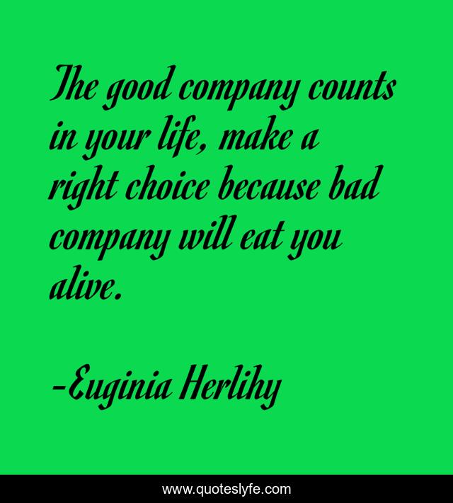 This page presents the quote "The good company counts in your life, make a right choice because bad company will eat you alive.". Author of this quote is Euginia Herlihy. .