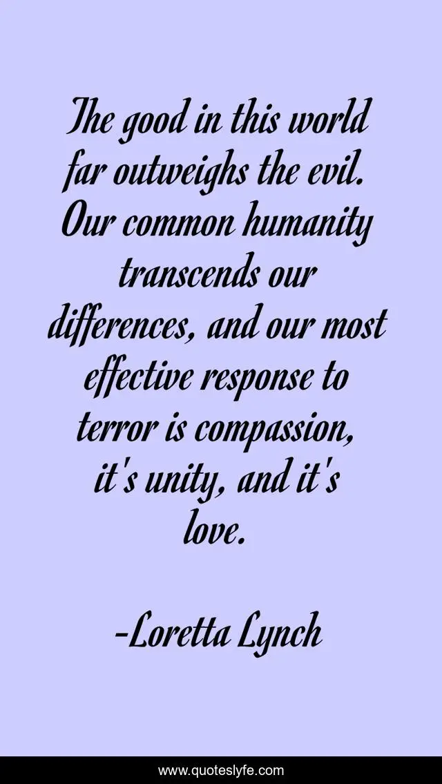 This page presents the quote "The good in this world far outweighs the evil. Our common humanity transcends our differences, and our most effective response to terror is compassion, it's unity, and it's love.". Author of this quote is Loretta Lynch. This quote is about compassion, unity, good,.