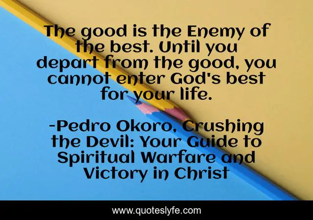 This page presents the quote "The good is the Enemy of the best. Until you depart from the good, you cannot enter God's best for your life.". Author of this quote is Pedro Okoro, Crushing the Devil: Your Guide to Spiritual Warfare and Victory in Christ. This quote is about enthusiasm, inspirational, spiritual-warfare,.