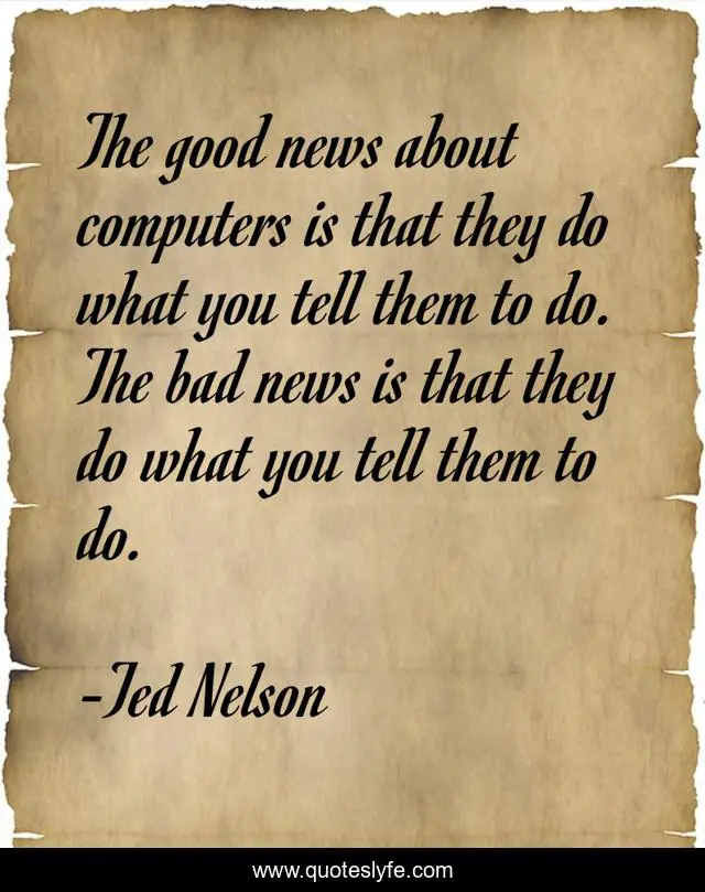 This page presents the quote "The good news about computers is that they do what you tell them to do. The bad news is that they do what you tell them to do.". Author of this quote is Ted Nelson. This quote is about news, good,.