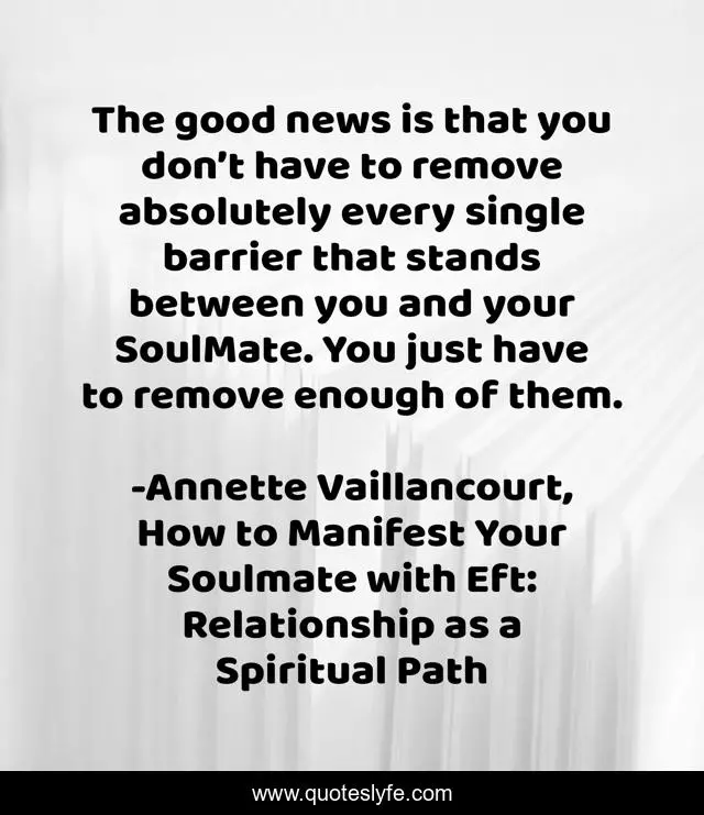 This page presents the quote "The good news is that you don’t have to remove absolutely every single barrier that stands between you and your SoulMate. You just have to remove enough of them.". Author of this quote is Annette Vaillancourt, How to Manifest Your Soulmate with Eft: Relationship as a Spiritual Path. This quote is about soulmate, removing-barriers, soulmates,.