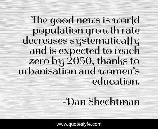 This page presents the quote "The good news is world population growth rate decreases systematically and is expected to reach zero by 2050, thanks to urbanisation and women's education.". Author of this quote is Dan Shechtman. This quote is about good, growth, women,.